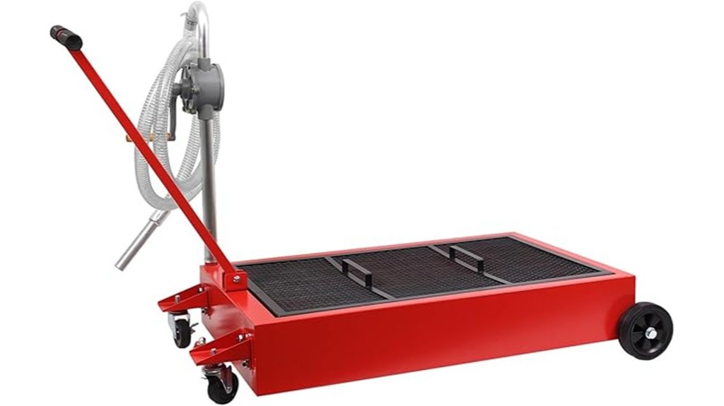 This feature guarantees parking convenience by letting you stop and work confidently without worrying about shifting or tipping. You’ll appreciate how this combination of mobility and stability liberates your workflow, making oil changes safer, more efficient, and less physically demanding in any professional or personal garage setting.